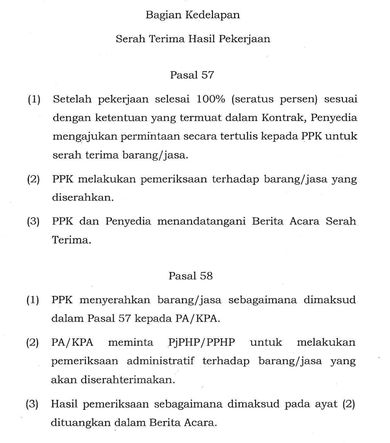 Barang yang perlu diperbaiki pekerjaan nya oleh penyedia; Sejak perencanaan barang/jasa sampai dengan serah terima hasil pekerjaan meliputi: Menyeluruh dari penyedia barang/jasa kepada pejabat pembuat. (4) berita acara pemeriksaan administrasi sebagaimana dimaksud pada. Komitmen yang dinyatakan dalam berita acara serah terima.